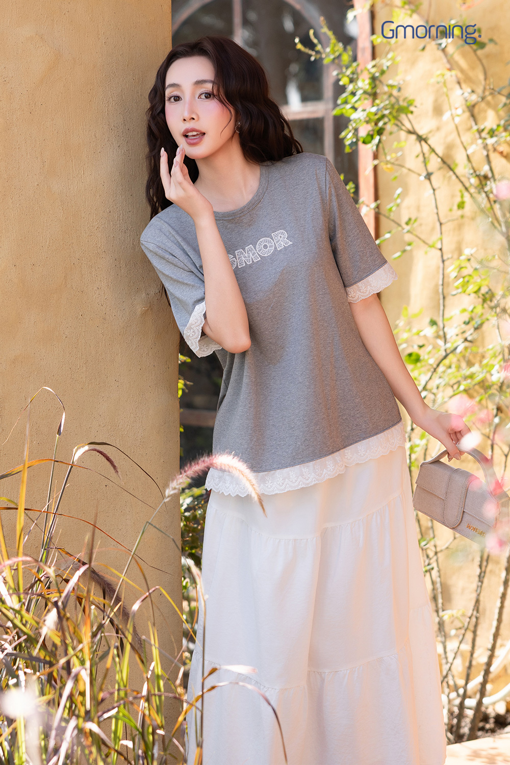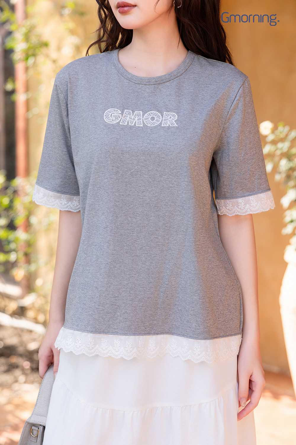 Trước ngực thêu phối ren chữ GMOR, tạo điểm nhấn nổi bật.