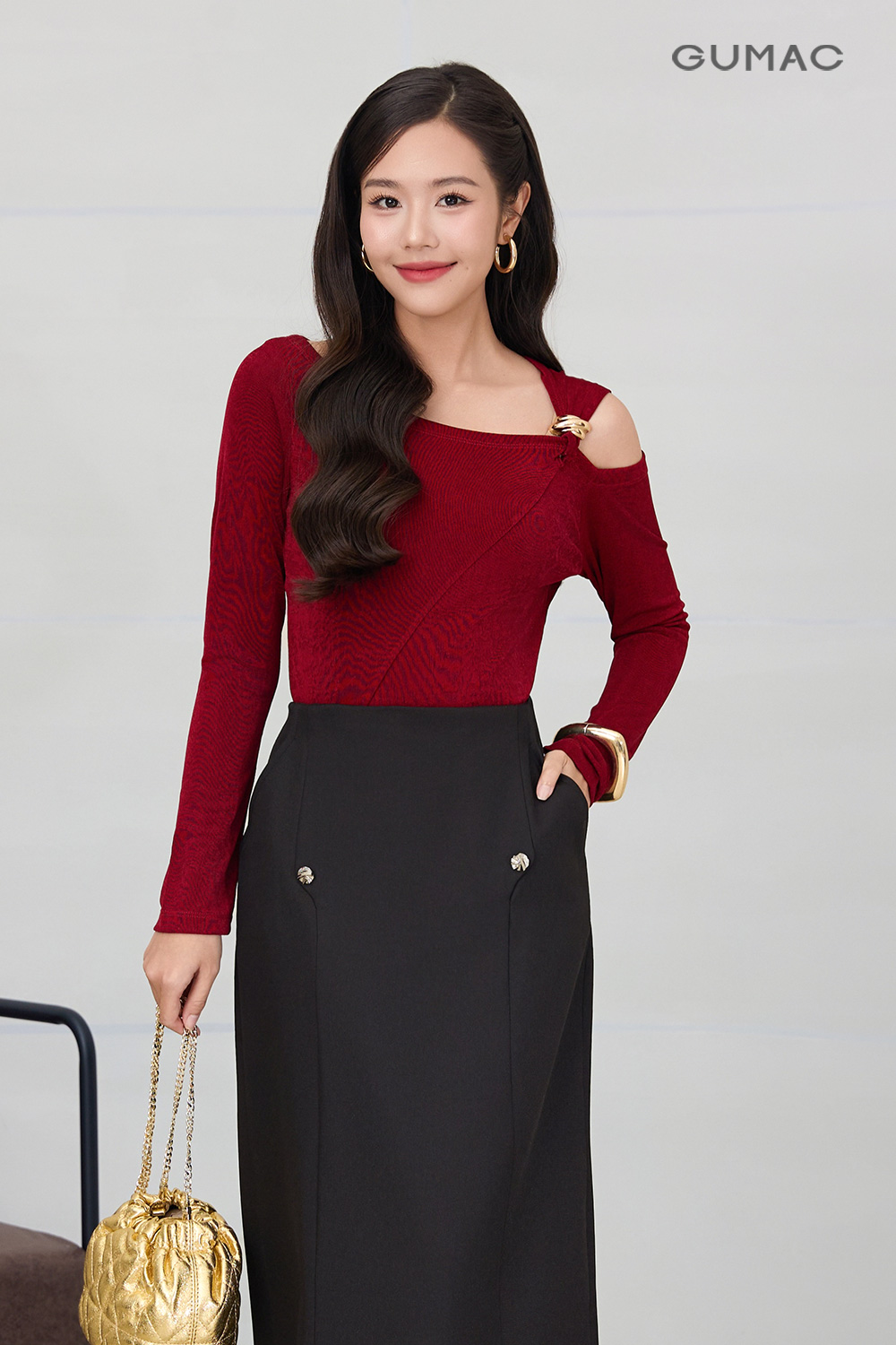 Áo thun thiết kế kiểu dáng hiện đại với điểm nhấn cổ lệch về bên vai, tạo hiệu ứng bất đối xứng thời thượng. Phom slim fit ôm nhẹ cơ thể, tôn dáng nhưng vẫn đảm bảo sự thoải mái nhờ kỹ thuật may khéo léo. Chi tiết bản phối nối liền từ thân trước ra thân sau kết hợp phụ kiện trang trí giúp tổng thể trở nên nổi bật mà không quá cầu kỳ. Tay dài, áo may một lớp gọn gàng.