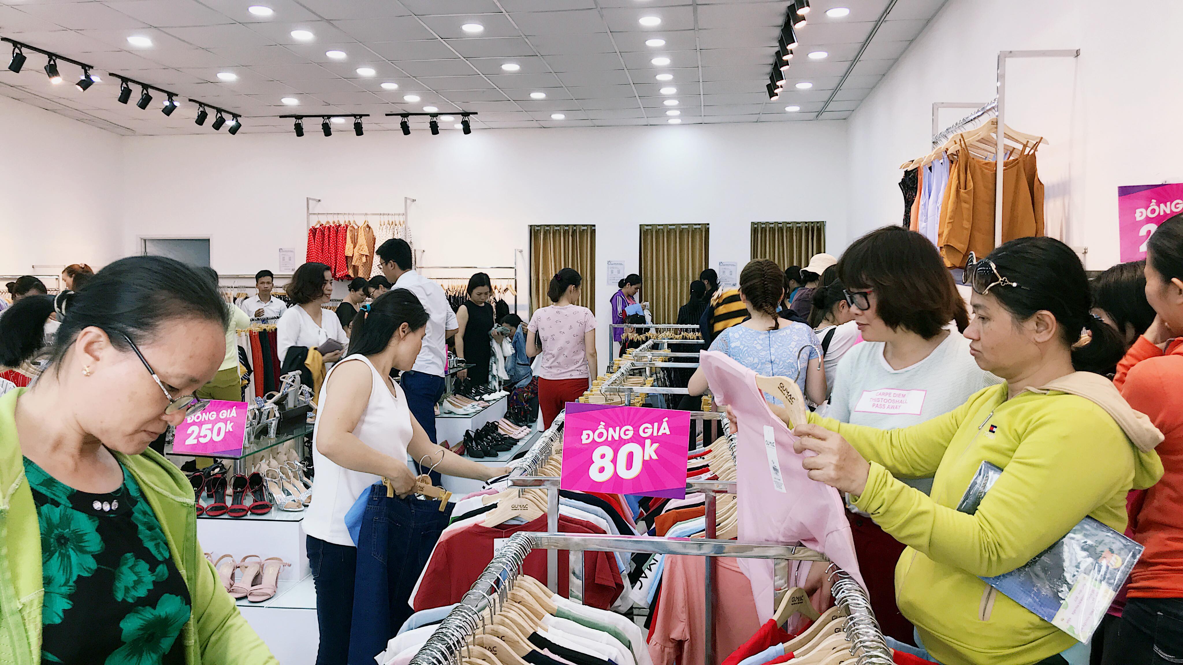 Mặc dù phải chịu cảnh chen lấn, tấp nập nhưng chị nào cũng háo hức và phấn khởi đến GUMAC mua hơn chục bộ đồ, vui vẻ xếp hàng rồi thanh toán.