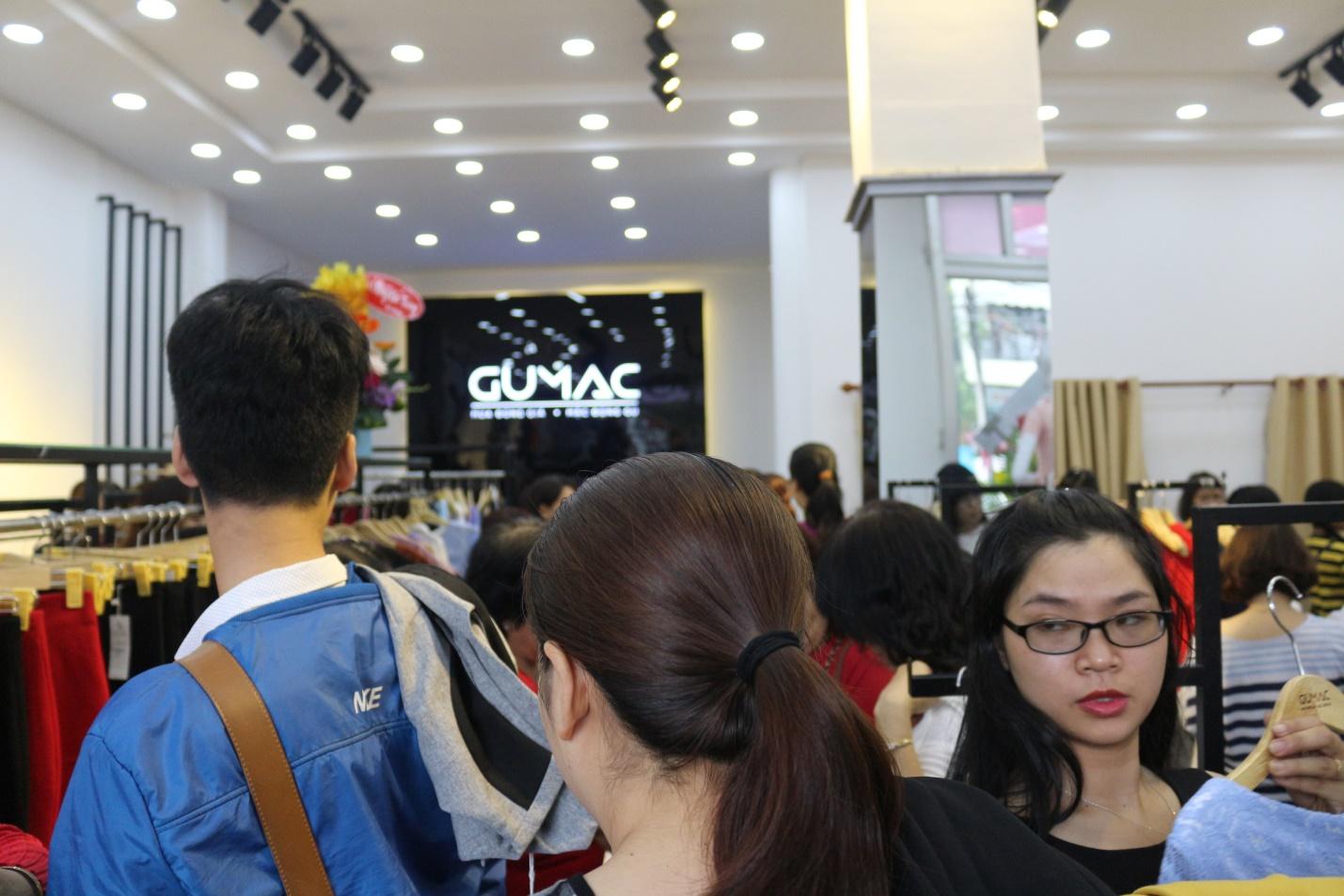 Ngay từ 8h sáng GUMAC đã đón 1 lượng khách hàng kỷ lục. Quầy tính tiền và phòng thay đồ luôn trong tình trạng chật kín không có lối đi. Rất nhiều khách hàng cố gắng chen lấn để mua cho mình những bộ đồ ưng ý nhưng vẫn có các chị ‘’bỏ cuộc’’ ra về và hẹn ngày hôm sau tới vì không chen nổi.