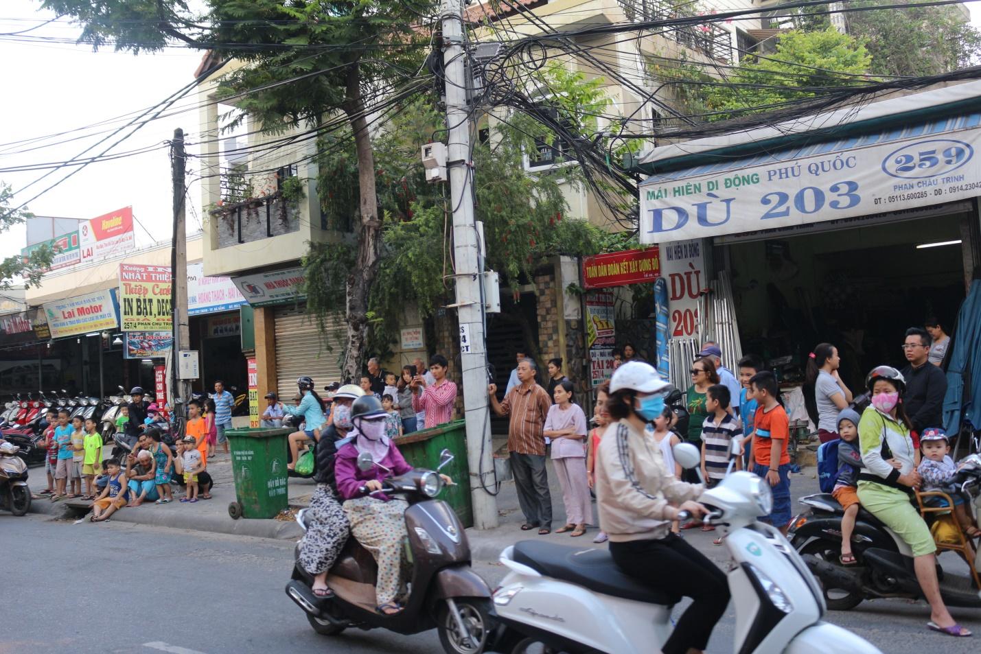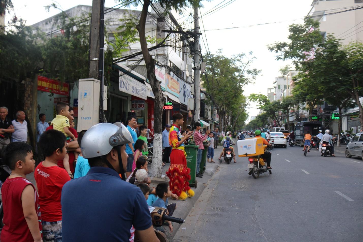 Mọi người đứng lại bên đường rất đông, đặc biệt là các gia đình có em nhỏ đều dừng lại để xem đội lân trình diễn.